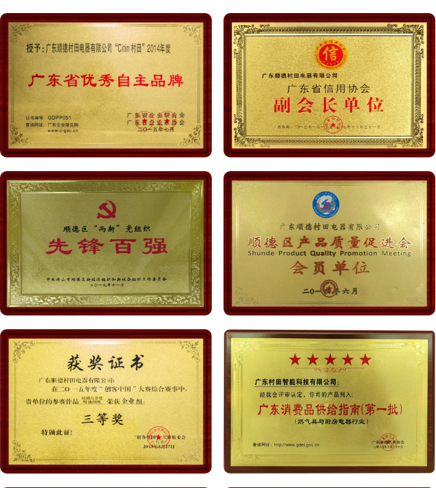 公司通过了“九游·体育(jiuyou.com)官方网站电工产品认证委员会(CCEE)认证”、荣获九游·体育(jiuyou.com)官方网站吸油烟机“高效净化环保之星”、“欧盟推荐产品”、“广东省高新技术产品”证书、“荣获燃气具生产许可证”、“九游·体育(jiuyou.com)官方网站五金制品协会吸油烟机分会理事单位”、“广东省信用协会副会长单位”、“广东燃气具协会副会长单位”、“广东顺德中小企业促进会副会长单位”、“2014