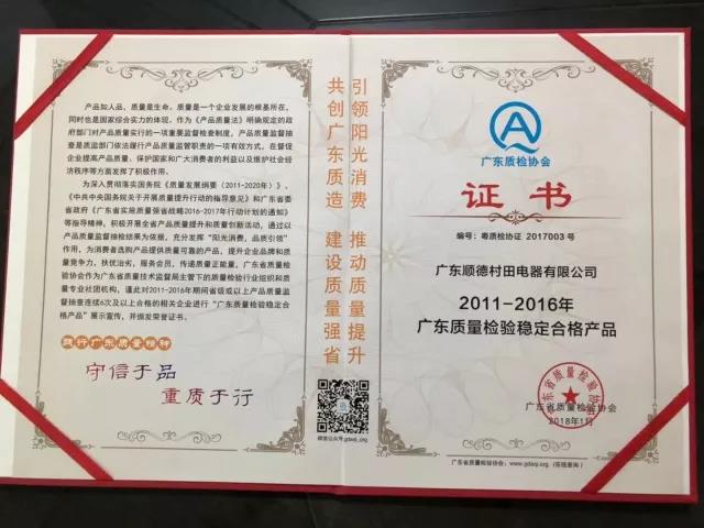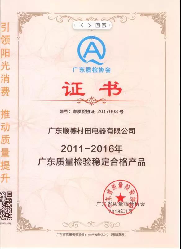 2018-04-29 15:58:52 点击量:1039近日,在广东省质量检验协会组织开展的2011-2016年度质量调查汇总活动中,广东顺德九游·体育(jiuyou.com)官方网站电器有限公司凭借卓越产品质量连续6次以上抽查合格,获得了由广东省质量检验协会颁发的“广东质量检验稳定合格产品”证书,可喜可贺!