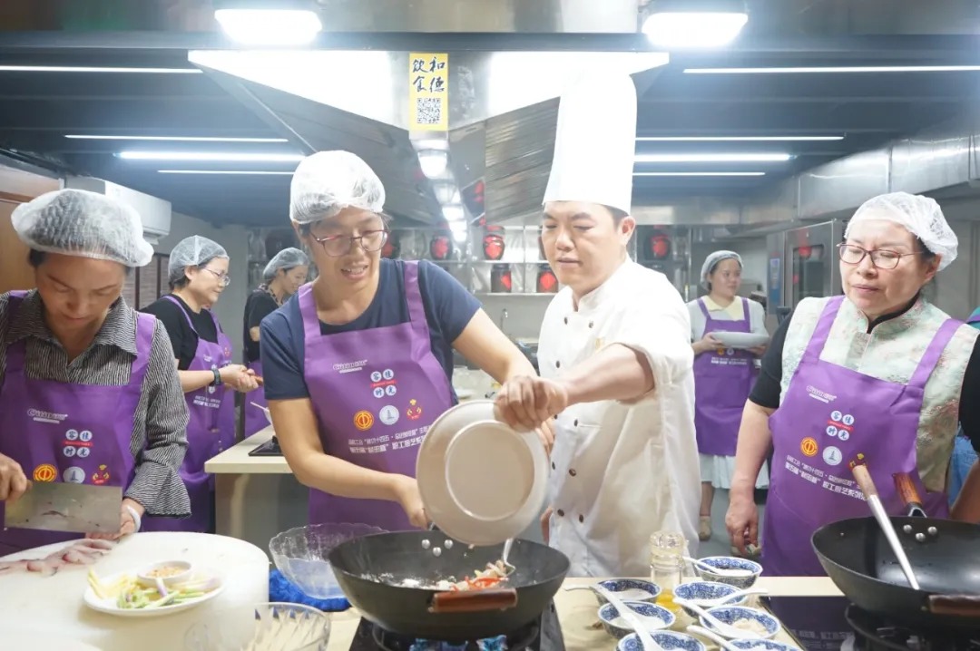 学员们全神贯注地观看,认真记录每一个要点。授课后,学员们更是手持着锅铲,在炉灶前忙碌着,将食材变成一道美味菜肴。老师根据学员的操作情况,进行面对面交流,手把手传授烹饪技术。