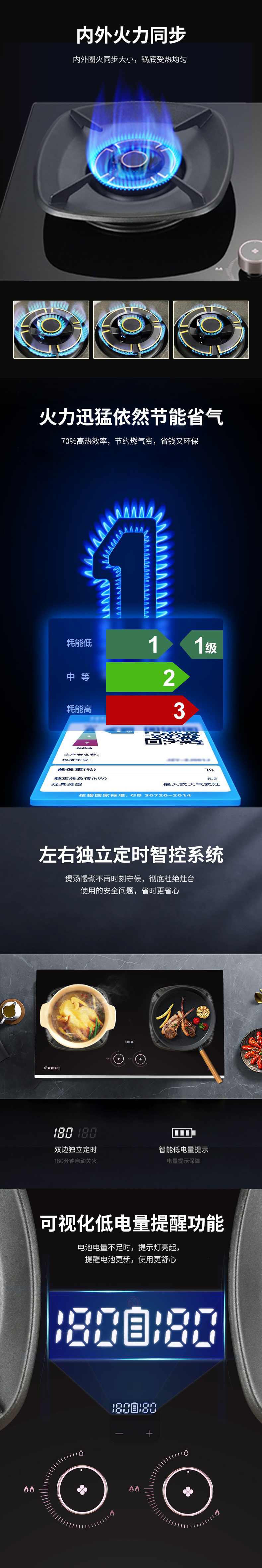 70%高效率+保洁炉头定时+低电量提醒零秒点火+宽频火火红点防烫提醒聚能方架+磨砂黑水盘