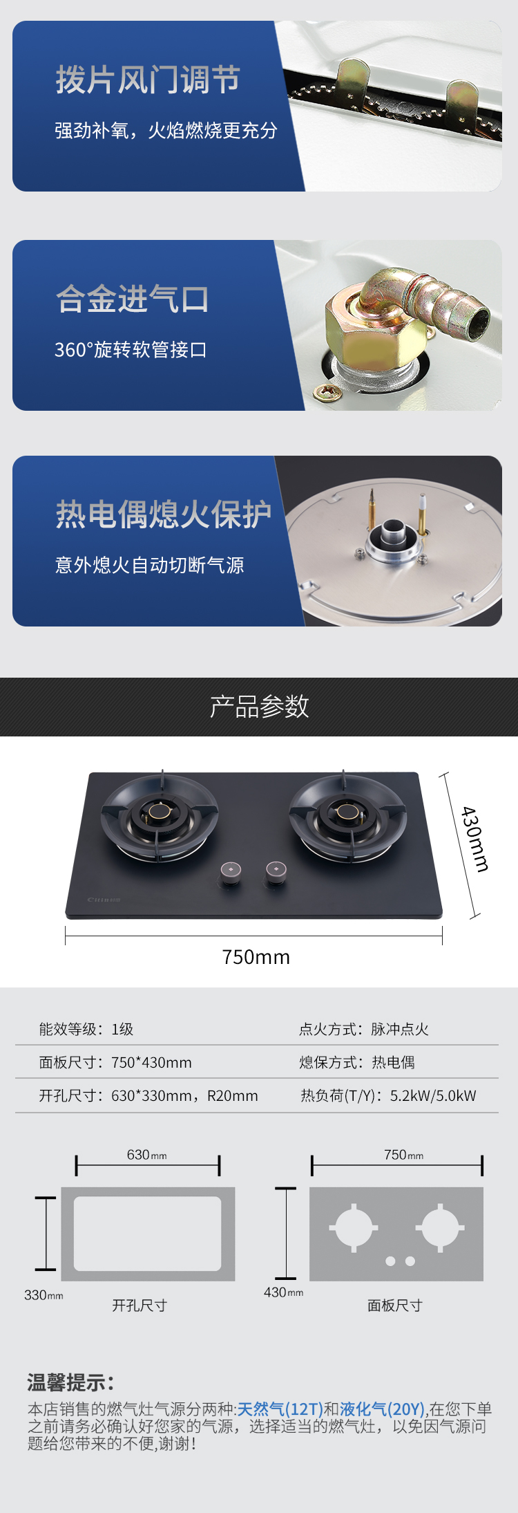 热负荷T:5.2kW热负荷Y:5.0kW面板尺寸:长750x宽430mm点火方式:脉冲点火熄保方式:热电偶