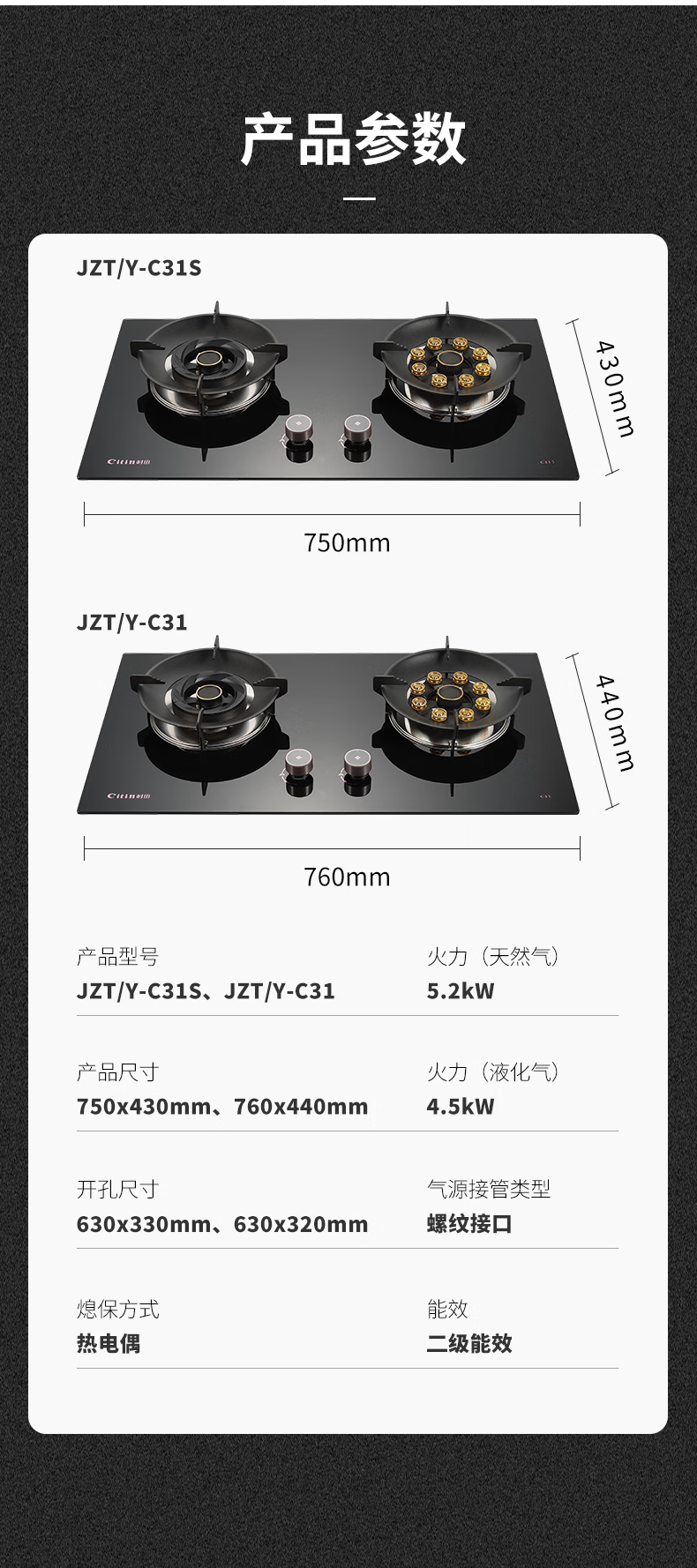 热负荷T:5.2kW热负荷Y:4.5kW面板尺寸:长760x宽440mm点火方式:脉冲点火熄保方式:热电偶特殊功能:九腔直喷