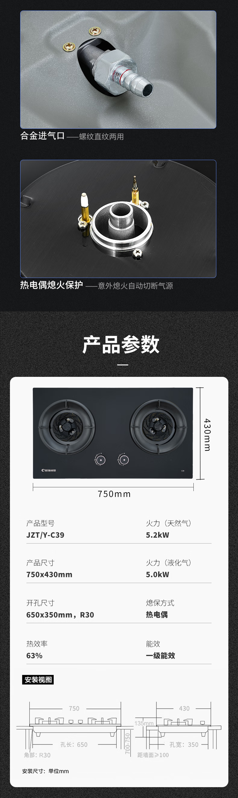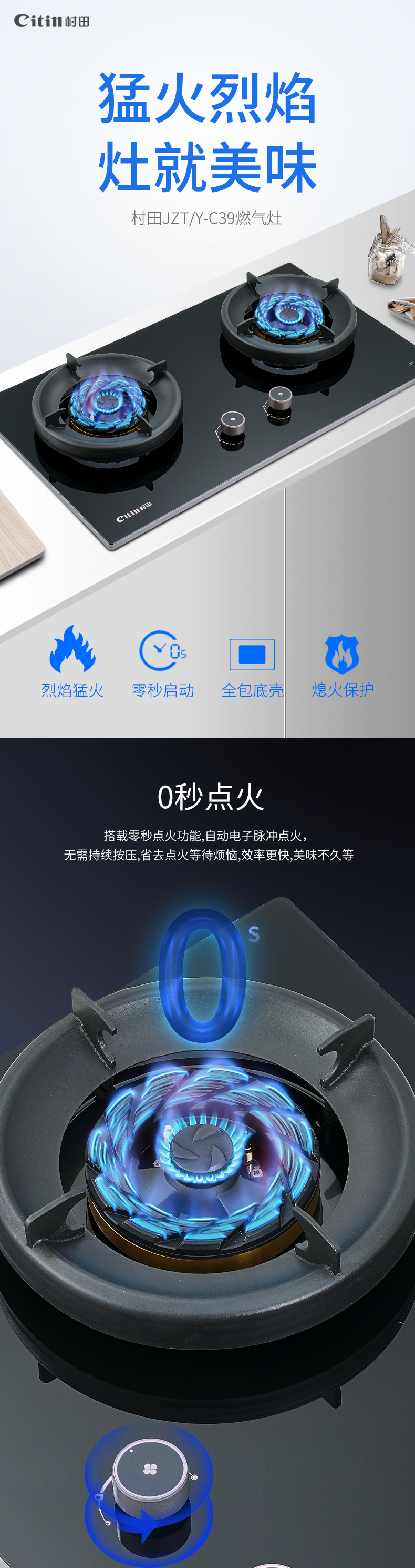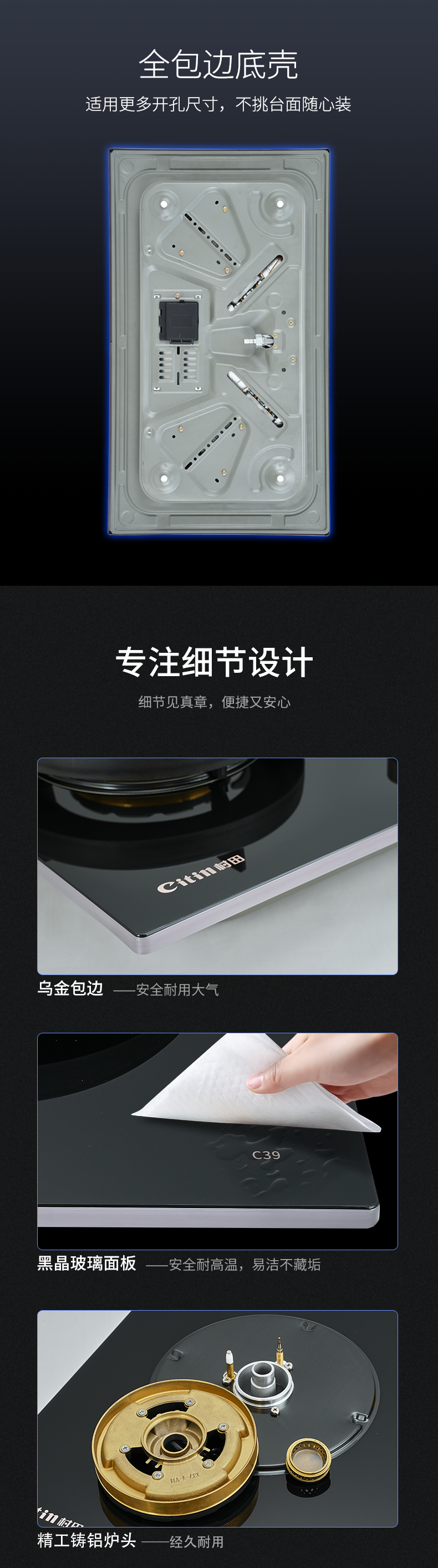 +童锁保护 +熄火保护 +高热效率 +防爆钢化玻璃乌金包边面板 +零秒点火功能 +包边底壳 +四定位彩钢圆形水盘 +聚能炉架
