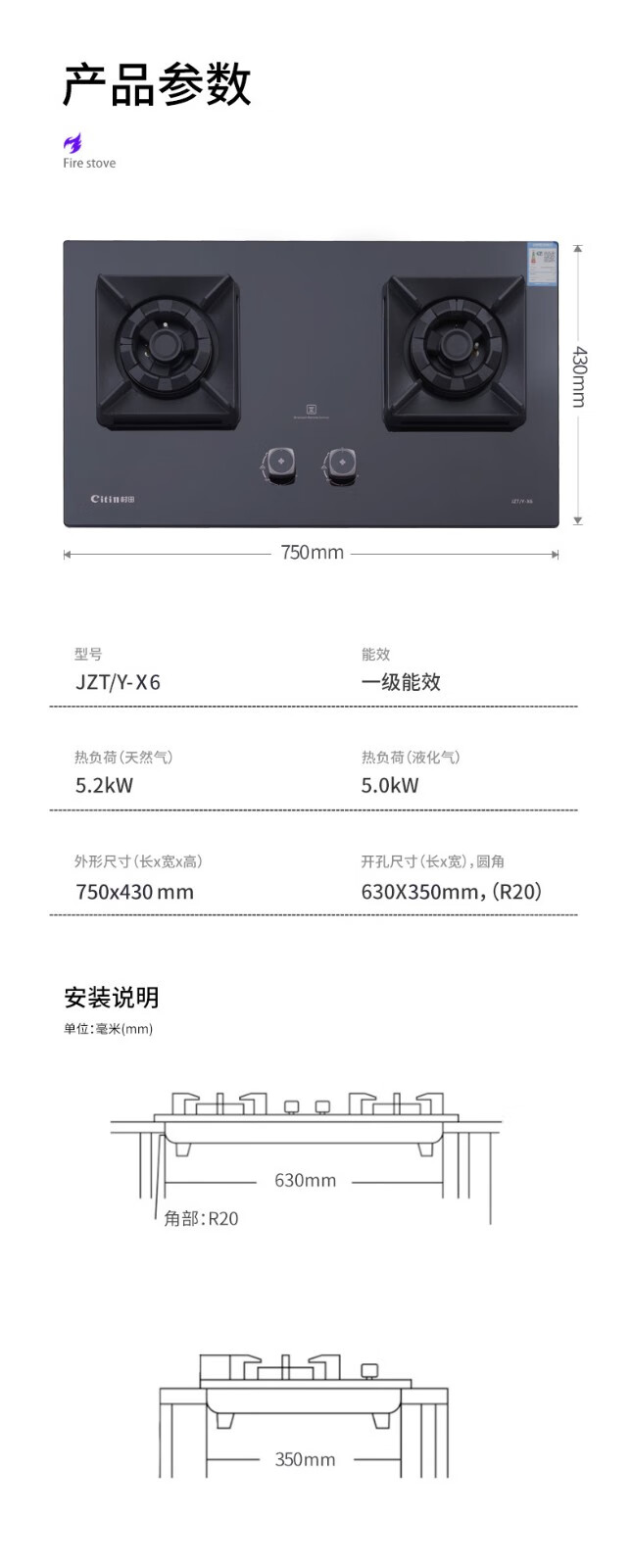 开孔尺寸:630x350mm(长x宽),R20边角热效率:65%