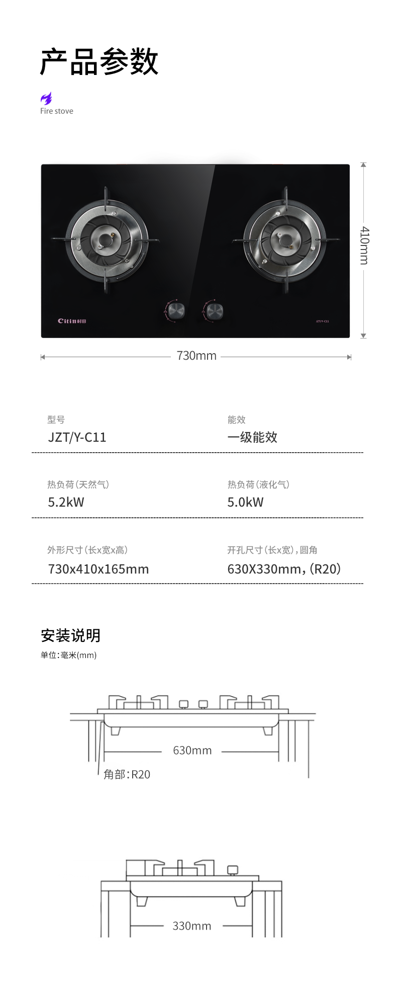 热负荷T 5.2kW热负荷Y 5.0kW面板尺寸 长730x宽410x厚6mm点火方式 脉冲点火熄保方式 热电偶