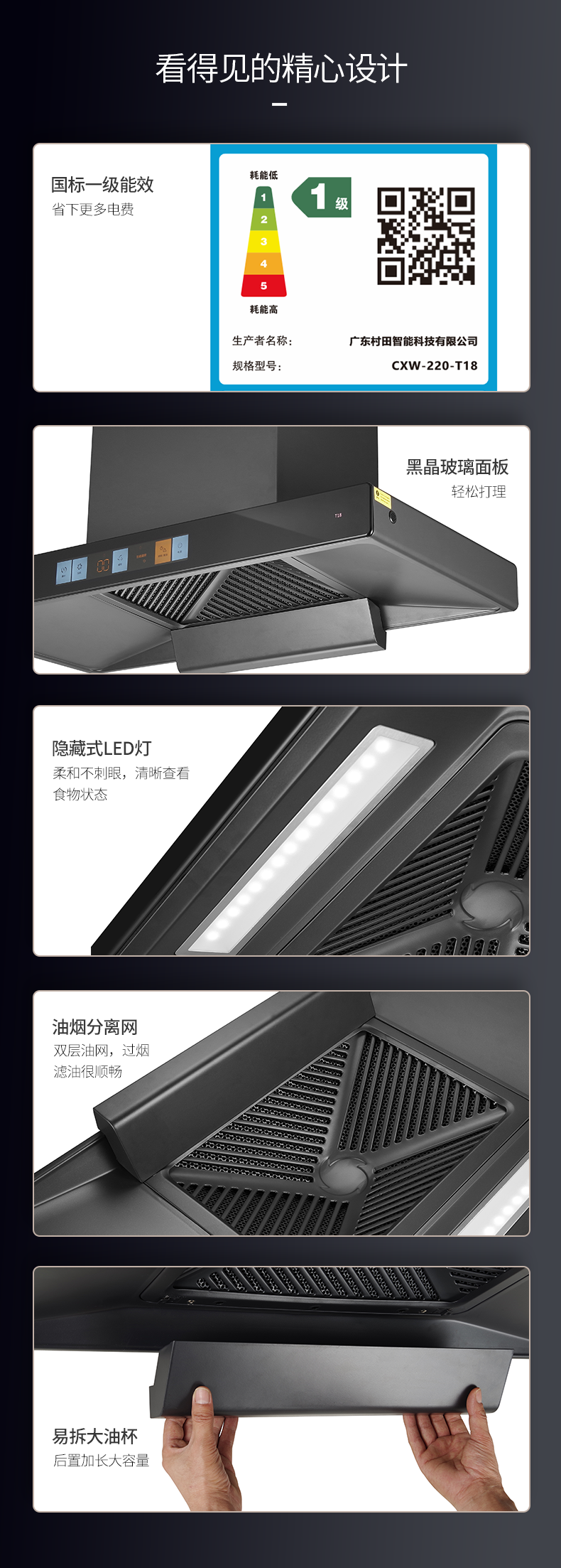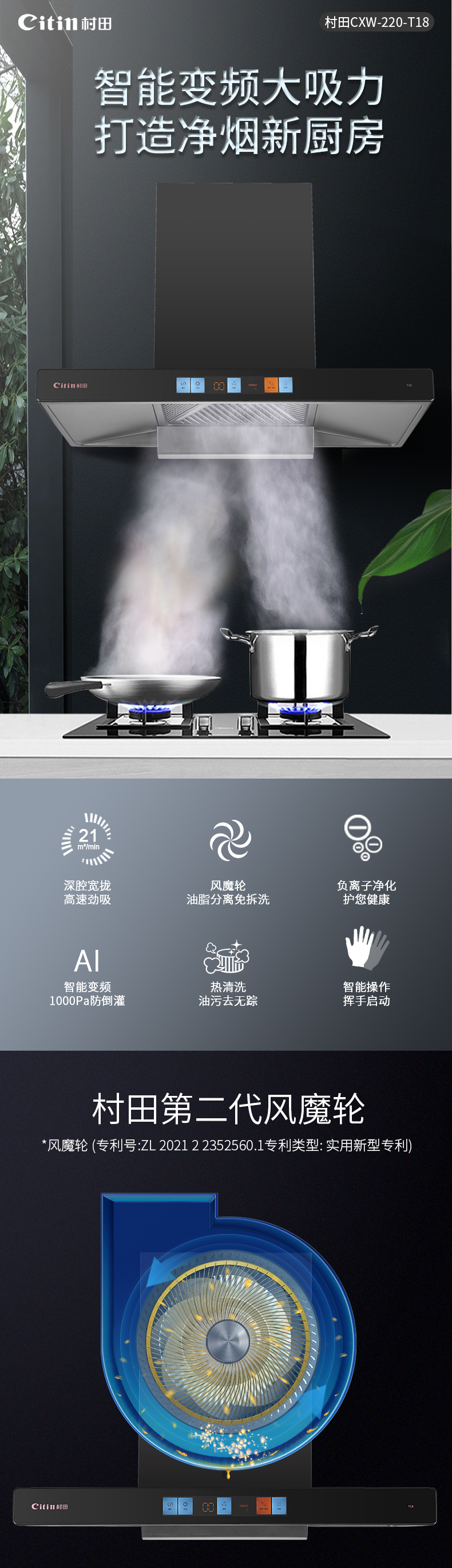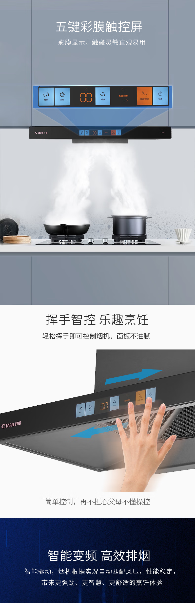 +挥手体感 +智能变频+彩屏开关 +风魔轮+负离子 +双层油网+双倍风压 +热清洗