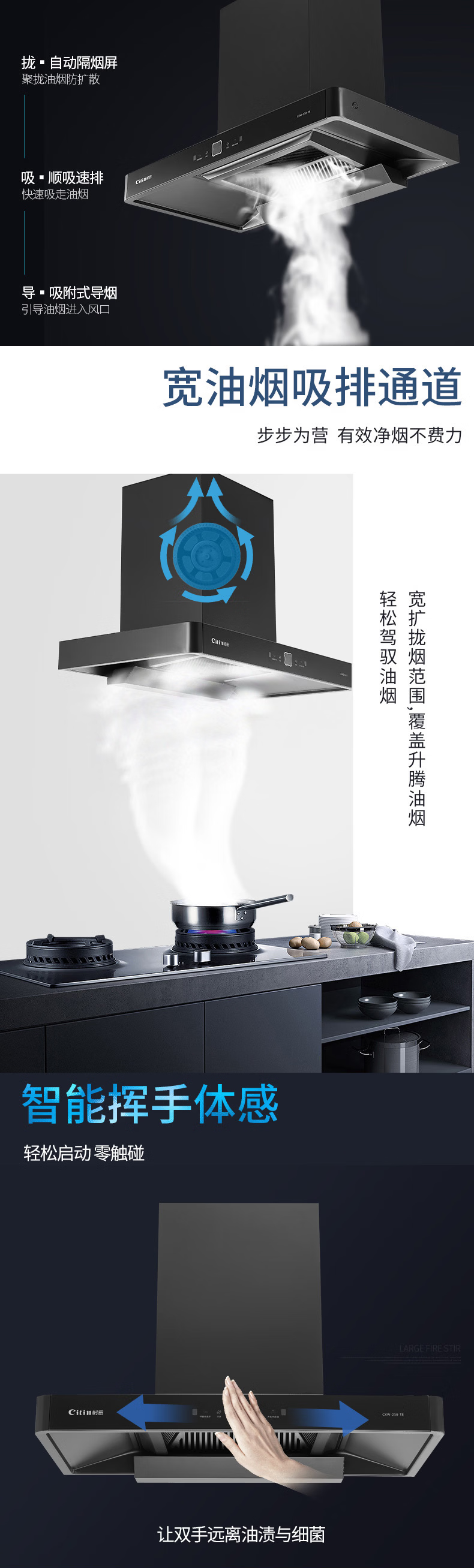 ◈挥手体感 ◈灰黑外观 ◈变频静压 ◈无极调速 ◈降噪静音 ◈一键爆炒 ◈无缝工艺 ◈澎湃大吸力 ◈专利负离子 ◈专利风魔轮