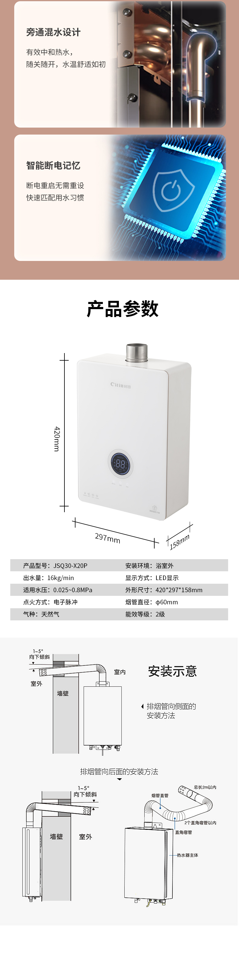额定容积:16L/分钟给排气方式:变频恒温强排式产品尺寸:宽297x高420 x深158毫米控制方式:电脑触控适用户型:一厨二卫以上特殊功能:零冷水