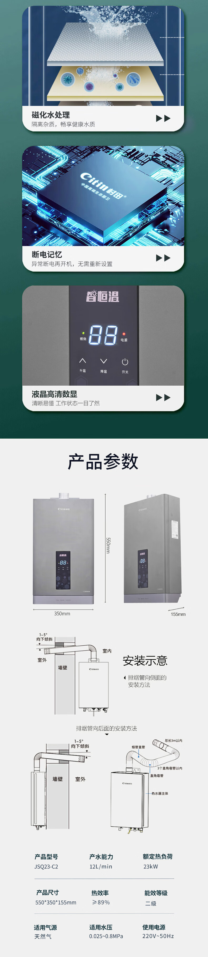 额定容积 12L/min控制方式 电脑触控给排气方式 数码恒温强排式产品尺寸 宽350x高600x深165mm控制方式 电脑触控适用户型 一厨一卫特殊功能 无盘管