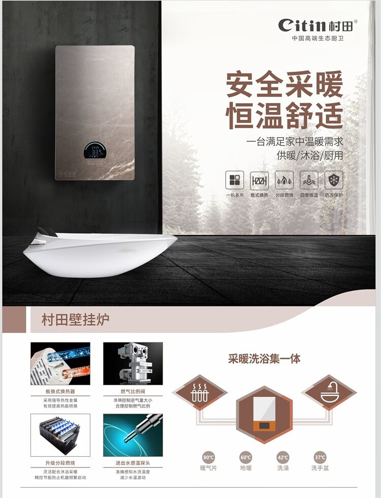 +岩板面板 +变频风机 +冷凝技术 +大屏显示+板式换热+一机多用 +ECO模式 +防冻技术+洗漱洗浴 +地暖供暖