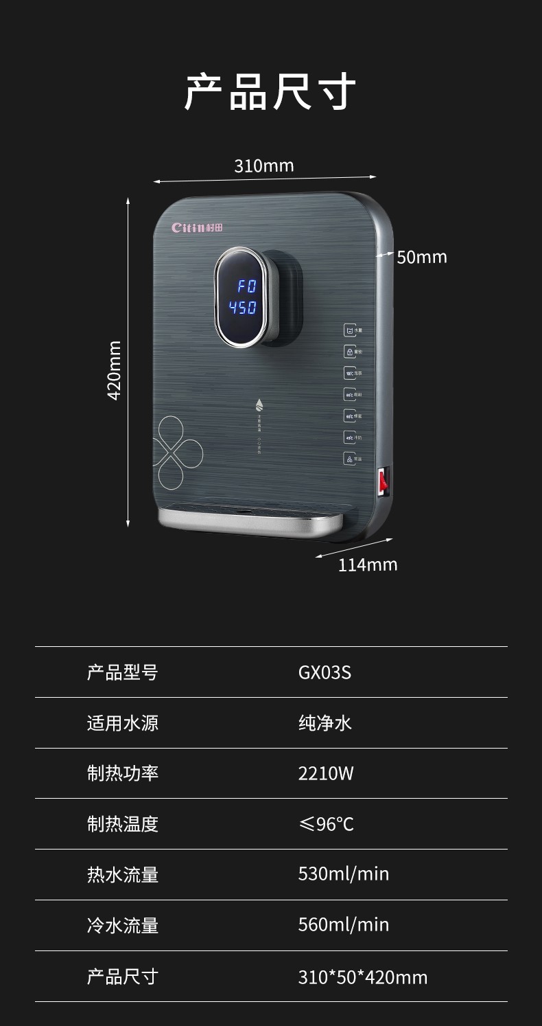 额定总功率 2210W热水流量 530ml/min产品尺寸 宽310x高420x深145mm控制方式 电脑触控冷水流量 550mI/min制热温度 ≤94'C